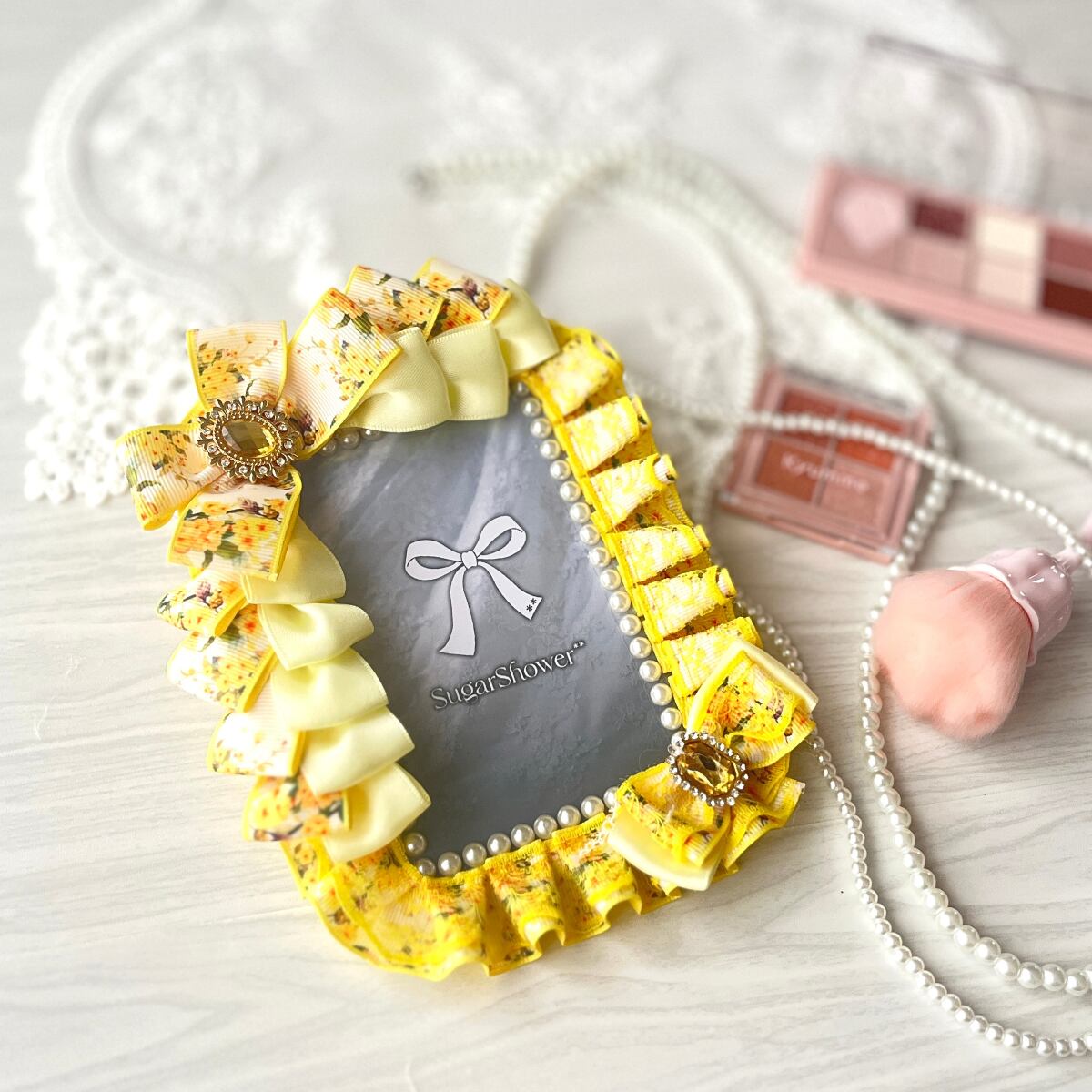 【訳あり アウトレット】B7 硬貨ケース 硬質ケース デコ リボン レース ブロマイドケース 黄色 ビジュー キーホルダー 持ち運びにも◎