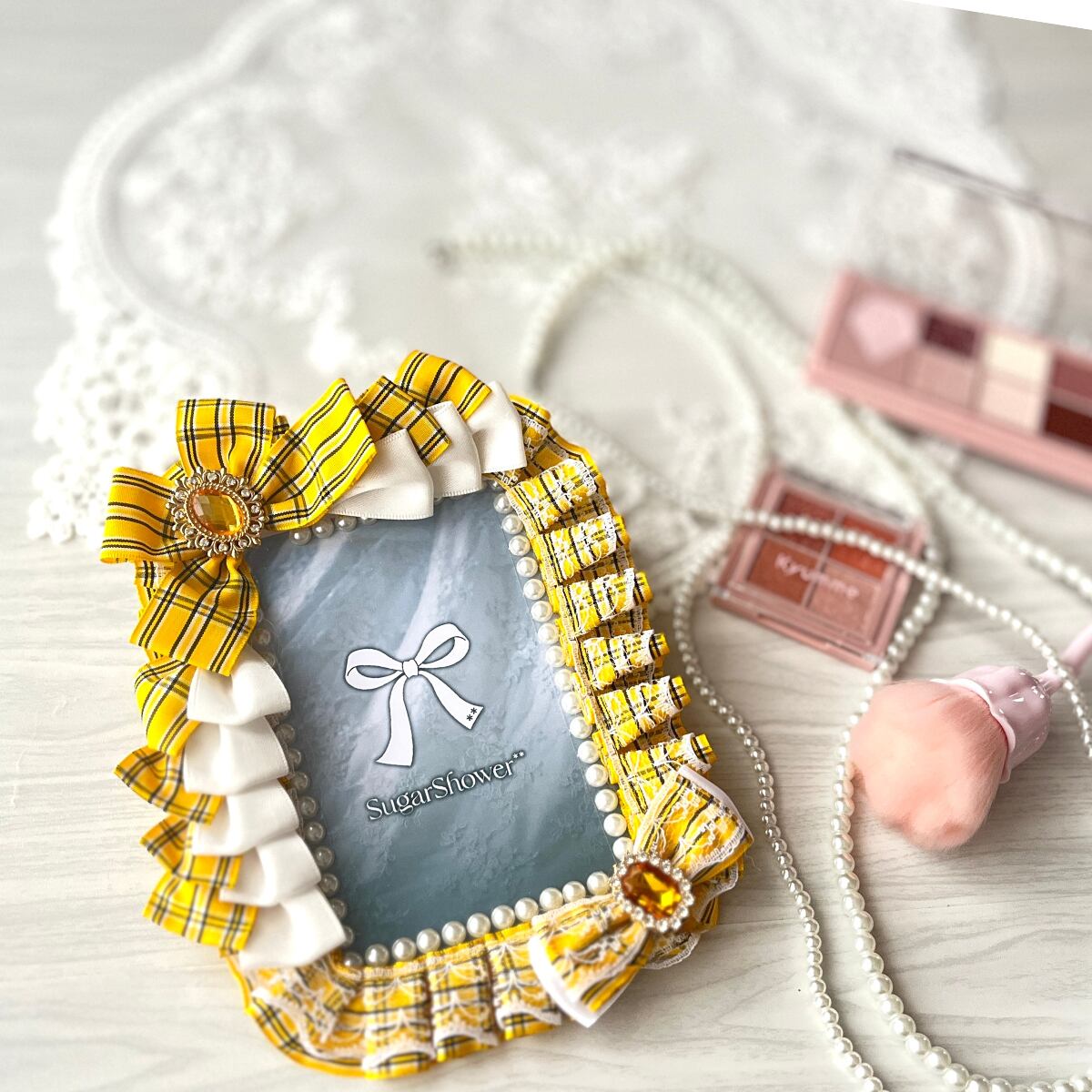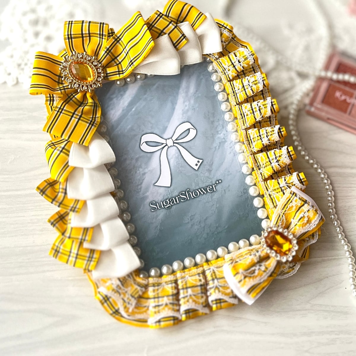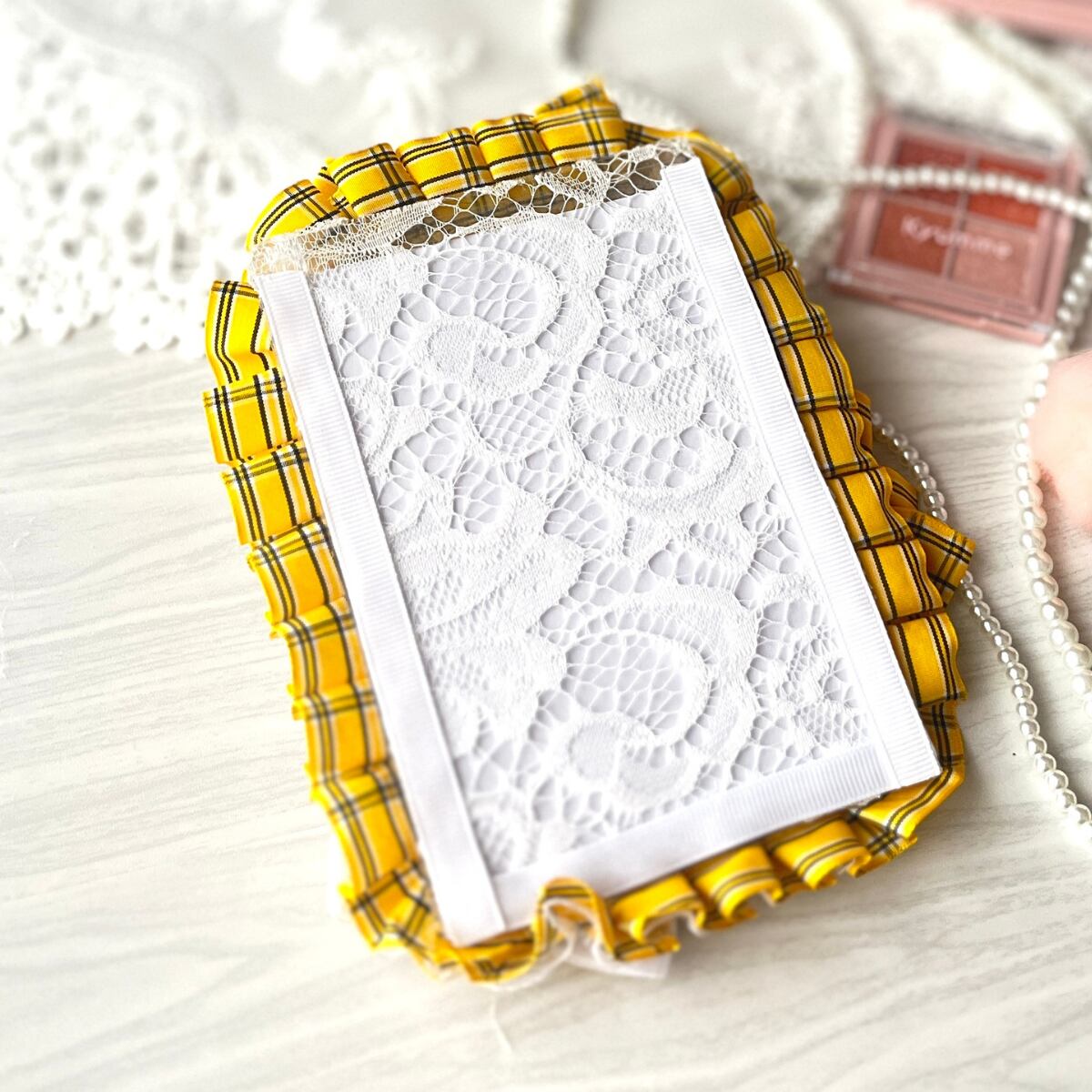 【訳ありアウトレット】B7サイズ 硬質ケースデコ(リボン・ビジュー付き)推し活ブロマイドケース/黄色チェック×ホワイトレース