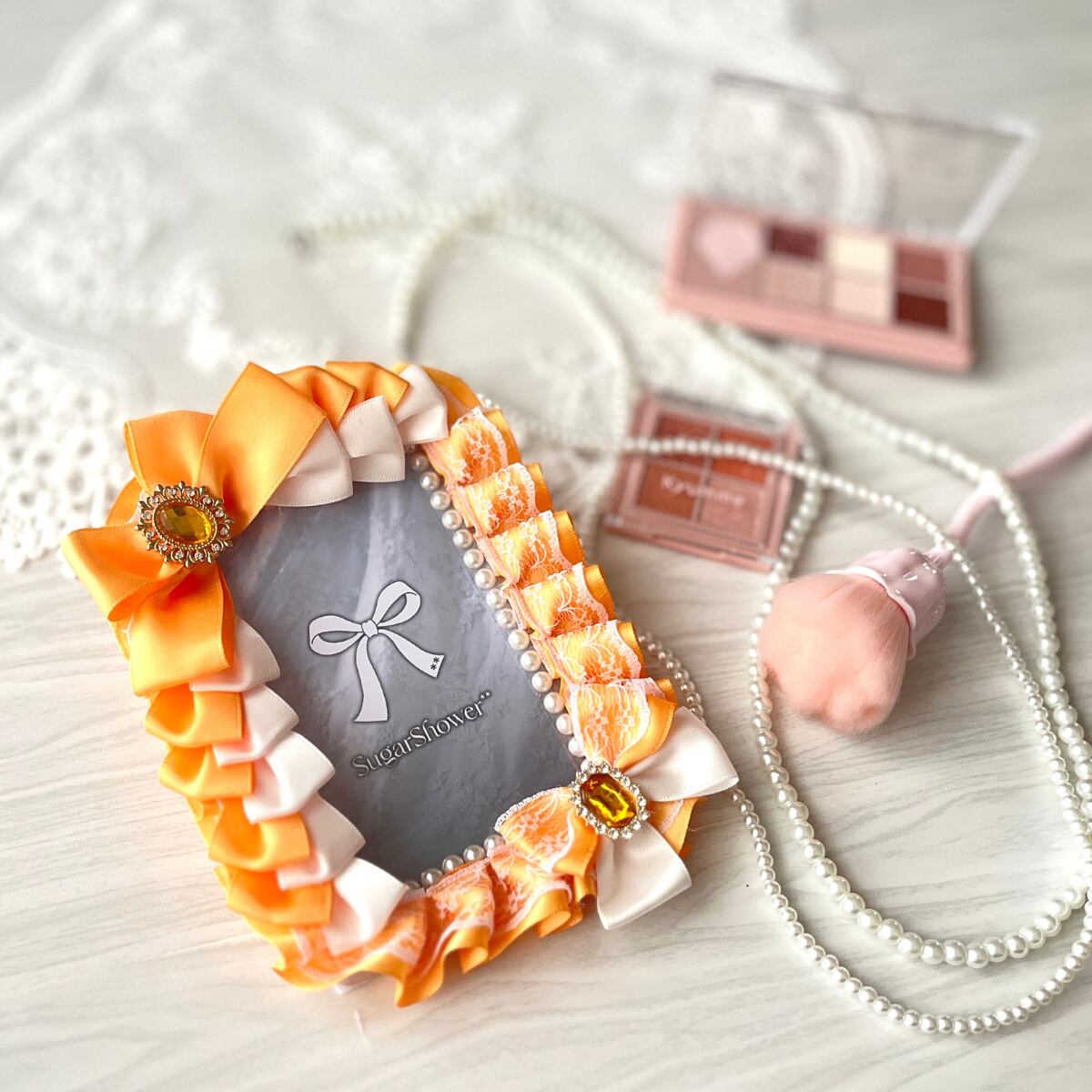 B7サイズの硬質ケースを使った、オレンジリボン×ビジュー×レースのデコブロマイドケースです。