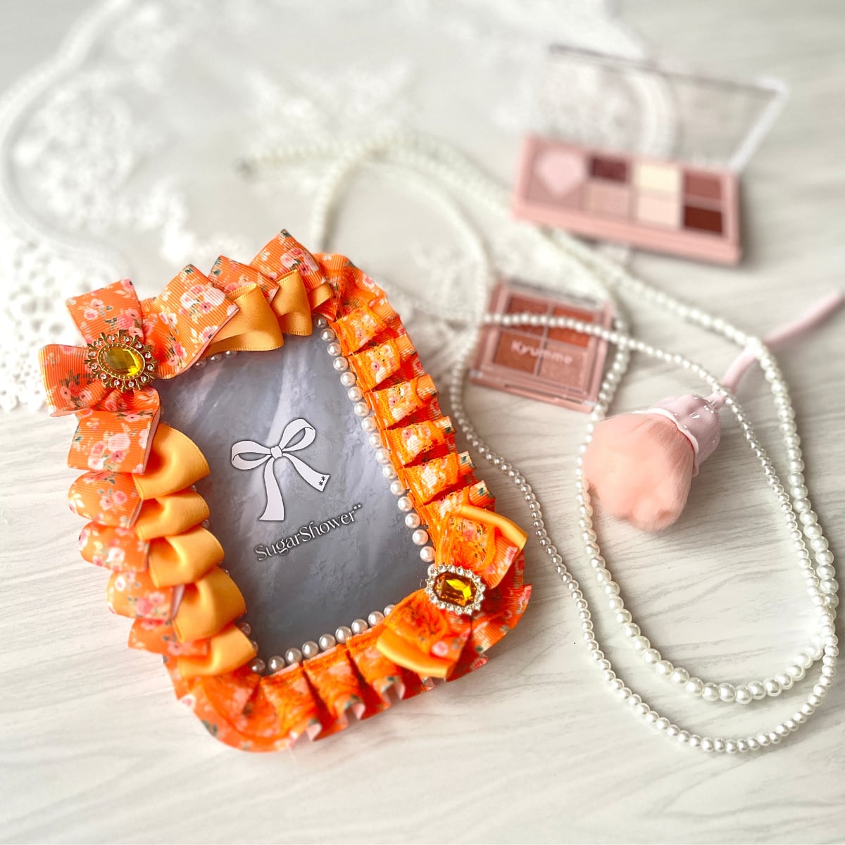 【訳ありアウトレット】B7サイズ 硬質ケースデコ オレンジ小花リボン×レース×ビジュー付き ブロマイド用硬貨ケースキーホルダー風持ち運び推し活アクセ