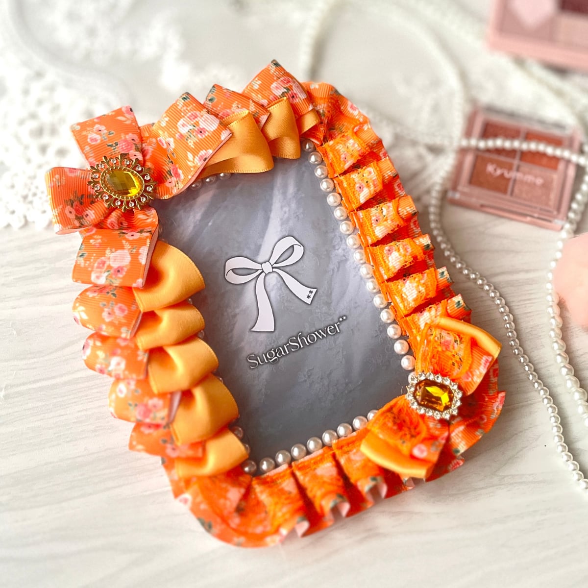 【訳ありアウトレット/お試し価格】B7サイズ 硬質ケースデコ(オレンジ小花リボン・ビジュー付き)推し活ブロマイドケース