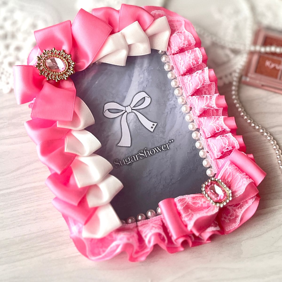 ・デザイン:ピンク×白リボン+ピンクビジュー+裏面レース+パール縁取り