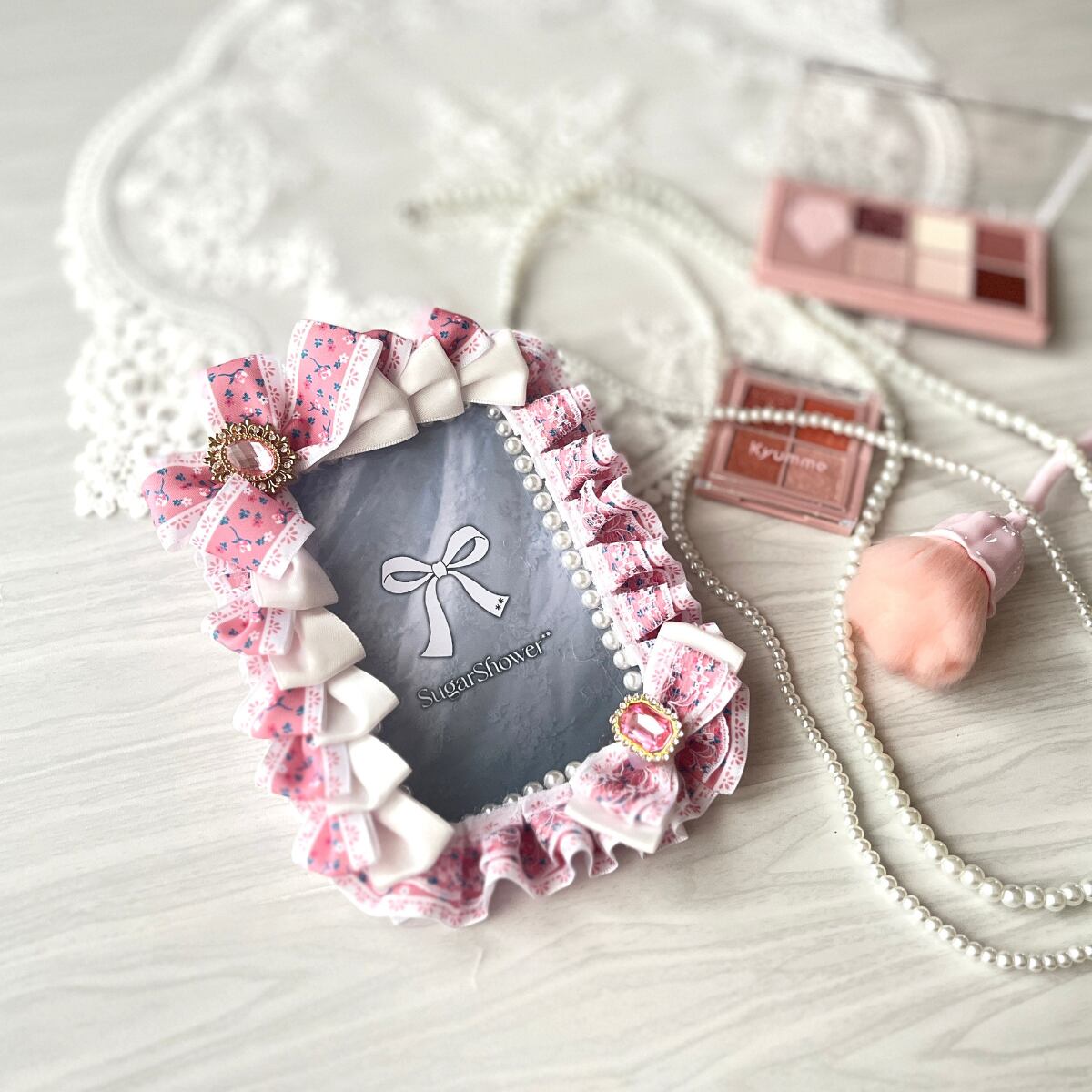 B7サイズの硬質ケースを使用した、ピンク小花リボンと白サブリボン、さらにピンクビジューとパール縁取りが華やかに輝くデコブロマイドケースです。