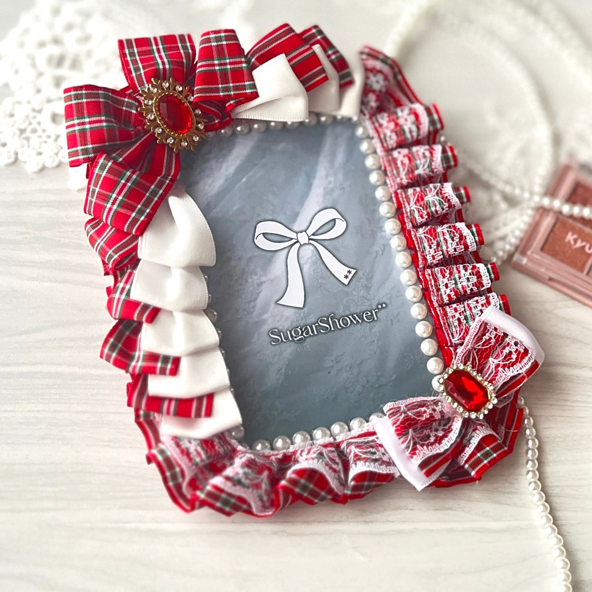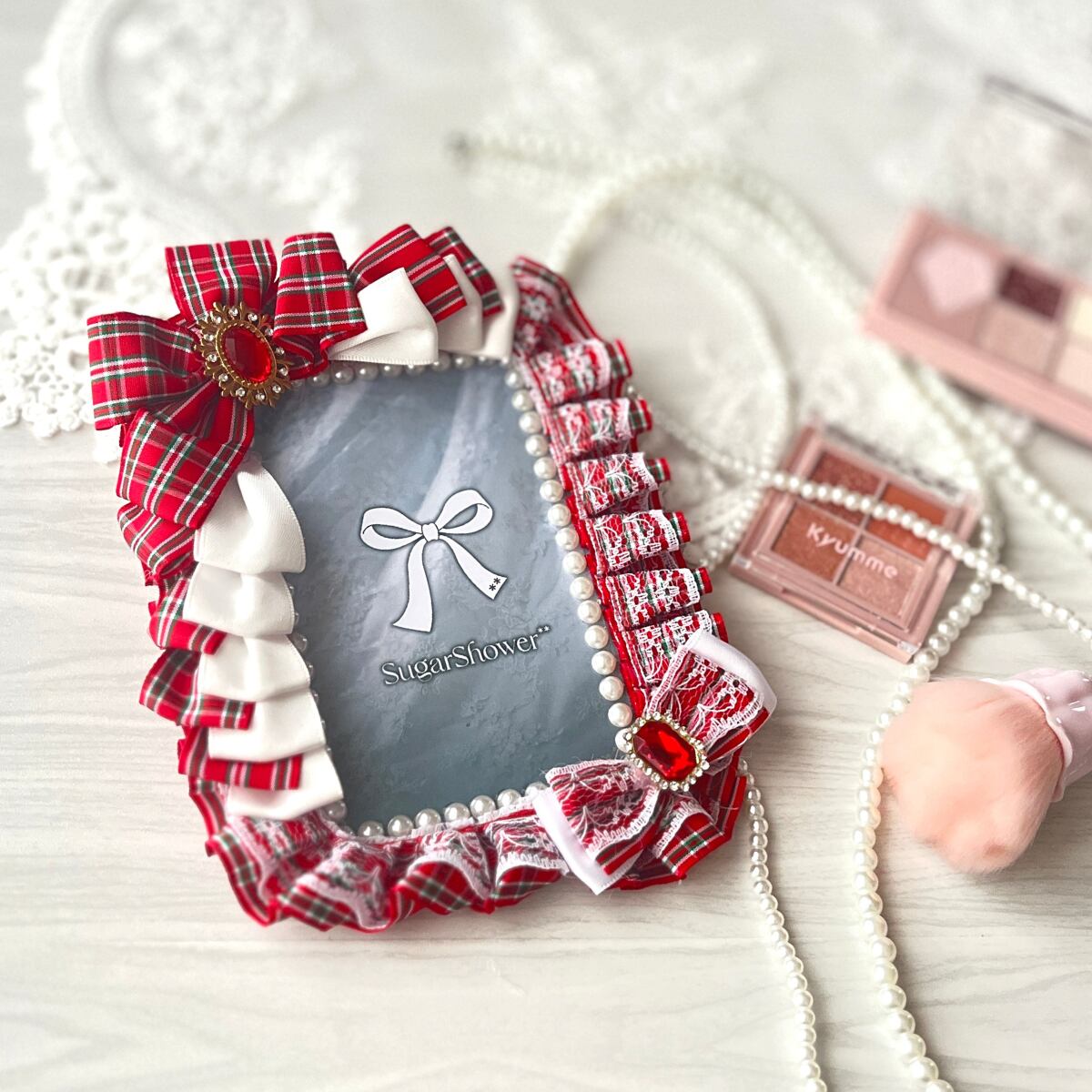 赤地に緑と白の細いラインが入ったチェック柄リボンに、白いレースとパールの縁取りを添えた、まるでクリスマスギフトのようなデザイン✨