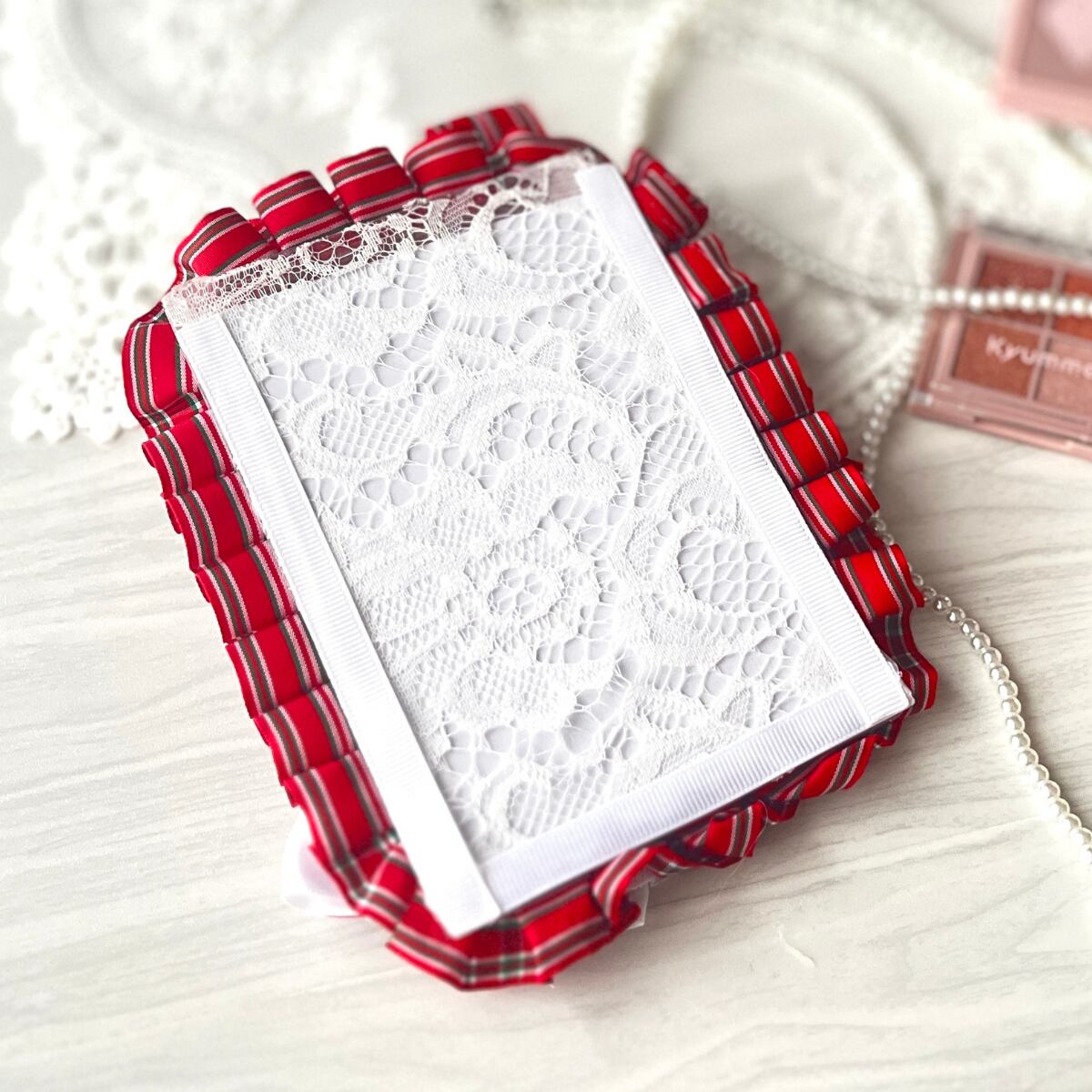 【訳ありアウトレット】B7 硬質ケースデコ 硬貨ケース 赤チェックリボン レースと赤ビジュー付き 推し活ブロマイド キーホルダー 持ち運びに クリスマス