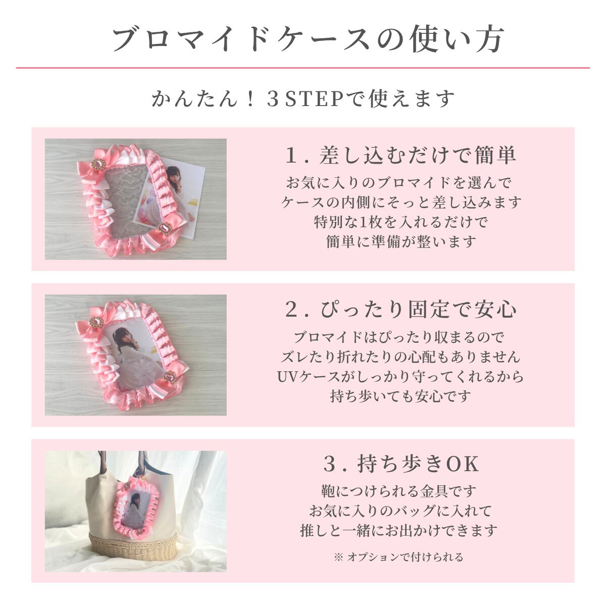 推しのブロマイドやトレカを可愛く飾りながら、持ち運べる推し活専用アイテム。