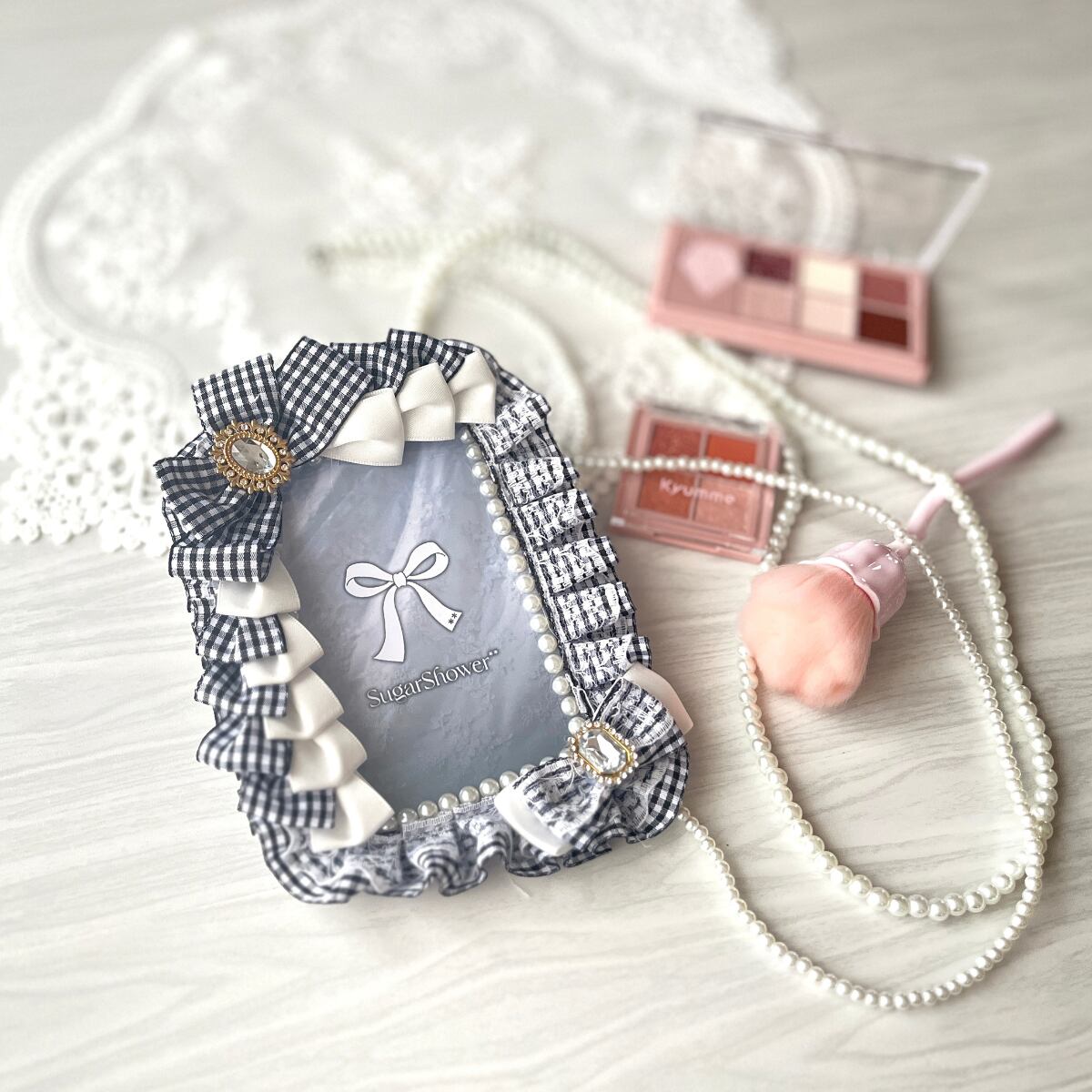 【訳ありアウトレット】硬質ケースデコ B7ブロマイドケース 硬貨ケースリボンデコ キーホルダー付き 持ち運びにも◎ レース×ギンガムチェックが可愛い