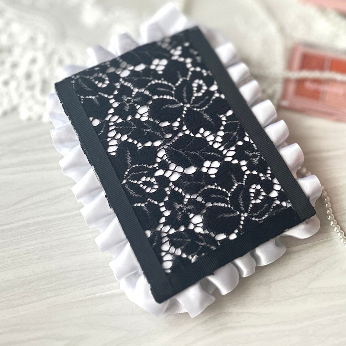 B7サイズの硬質ケースに、白のリボンと黒レースを合わせたモノトーンデザイン。