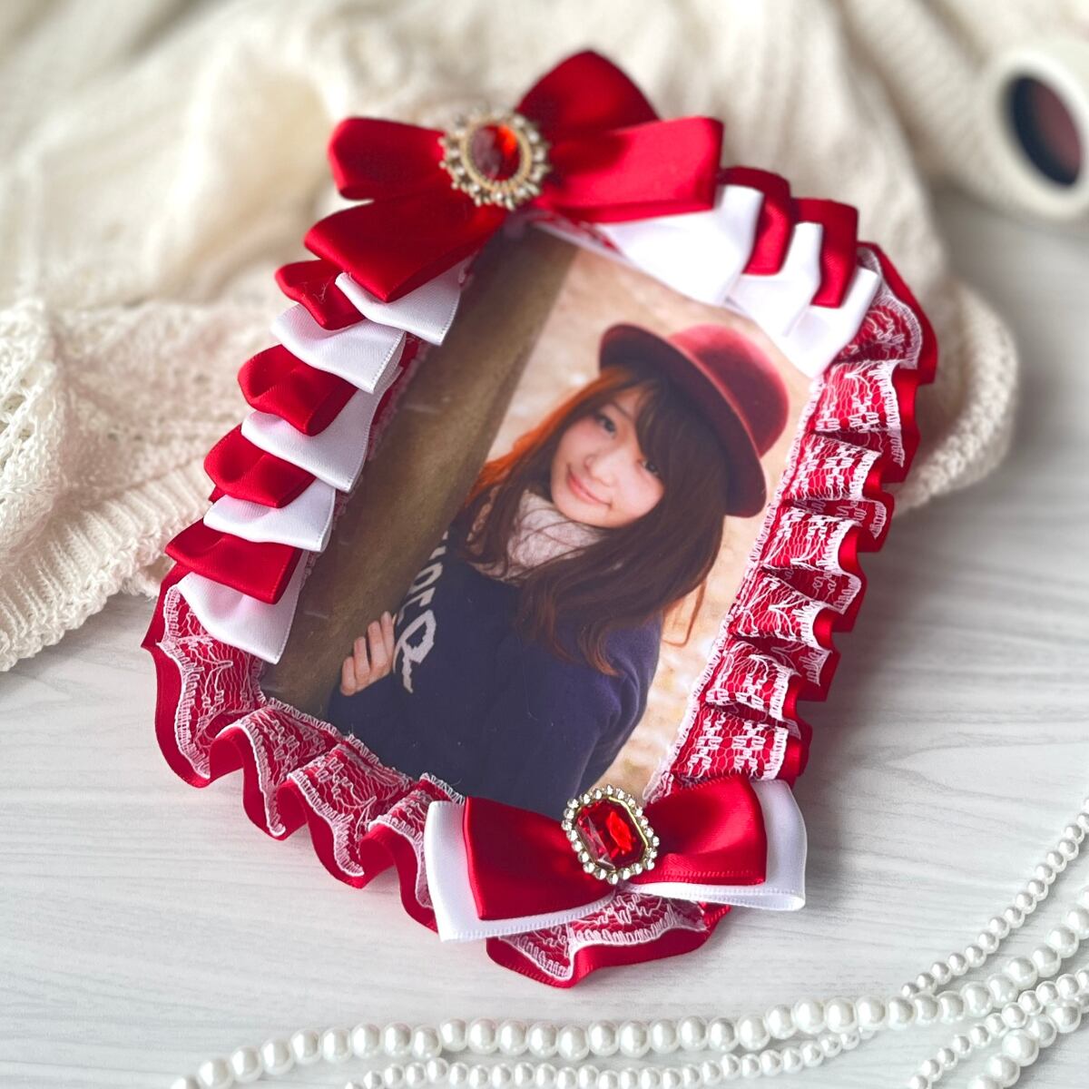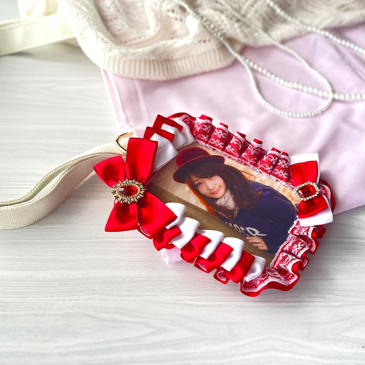硬貨ケース 硬質ケース デコ ブロマイド UV対応 キーホルダー 持ち運び リボン レース 推し活 観劇 痛バッグ ハンドメイド ギフト 大人可愛い 赤 華やかデザイン