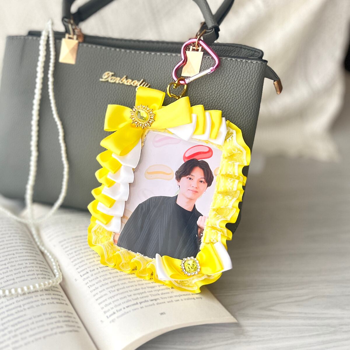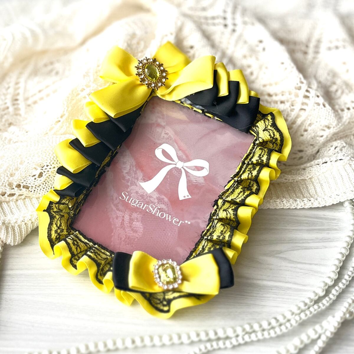 硬貨ケース 硬質ケース デコ ブロマイド UV対応 キーホルダー 持ち運び リボン レース 推し活 観劇 痛バッグ ハンドメイド 大人可愛い 華やかデザイン イエロー